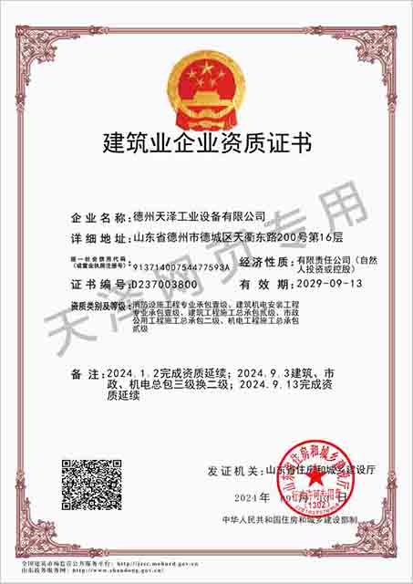 德州天澤工業(yè)設(shè)備有限公司成立于2003年(前身為德州天元集團(tuán)天明工業(yè)設(shè)備安裝公司),經(jīng)過(guò)20多年的發(fā)展,現(xiàn)成長(zhǎng)為擁有職工600余人,各類專業(yè)技術(shù)人員近300余人,年生產(chǎn)能力兩億元以上,以建筑機(jī)電安裝工程、消防設(shè)施安裝工程施工為主,集建筑工程施工、市政工程施工、建筑智能化工程施工、園林綠化工程施工、工程管理服務(wù)、物業(yè)管理、電氣機(jī)械設(shè)備銷(xiāo)售等多元化經(jīng)營(yíng)于一體的綜合型企業(yè)。2005年,企業(yè)按照國(guó)際標(biāo)準(zhǔn)建立的質(zhì)量管理體系,通過(guò)了ISO質(zhì)量管理體系認(rèn)證、環(huán)境管理體系認(rèn)證、職業(yè)健康安全管理體系認(rèn)證。施工工程遍布山東、河北、四川、江蘇等地,最具代表性的工程有:山東省德州市百腦匯資訊廣場(chǎng)機(jī)電安裝工程、德州經(jīng)濟(jì)開(kāi)發(fā)區(qū)天元大廈機(jī)電安裝工程、陵城區(qū)人民醫(yī)院機(jī)電安裝工程、德州金魯班大廈機(jī)電安裝工程、河北故城金辰小區(qū)機(jī)電安裝工程、北川地震災(zāi)后援建工程等。多年來(lái),公司始終堅(jiān)持“以人為本,建精品工程,創(chuàng)行業(yè)品牌”的經(jīng)營(yíng)理念,先后榮獲。ㄊ校┘(jí)泰山杯、天府杯、魯安杯等獎(jiǎng)項(xiàng),申報(bào)各種功法、多項(xiàng)專利。